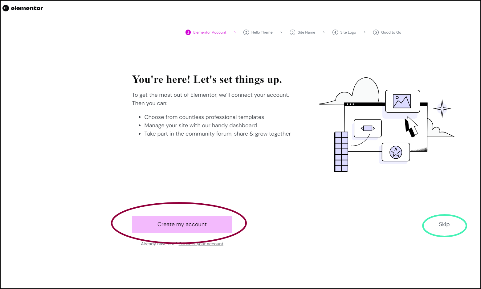 If you don’t have an Elementor account, you can create one by following the procedures below. Setting up an account will give you access to the Elementor Template Library, among other benefits.