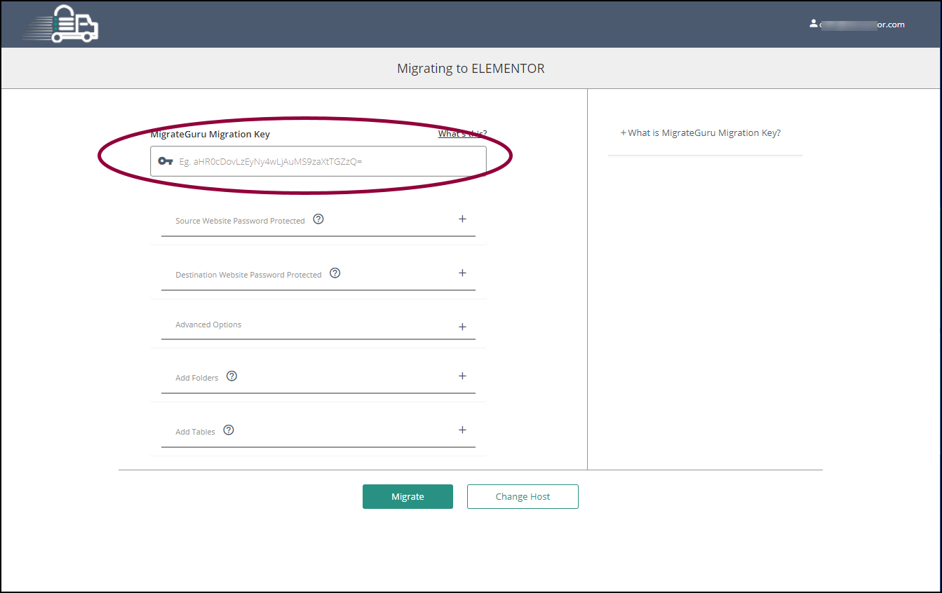 - In the MigrateGuru Migration Key field, paste the key you copied in step 6.