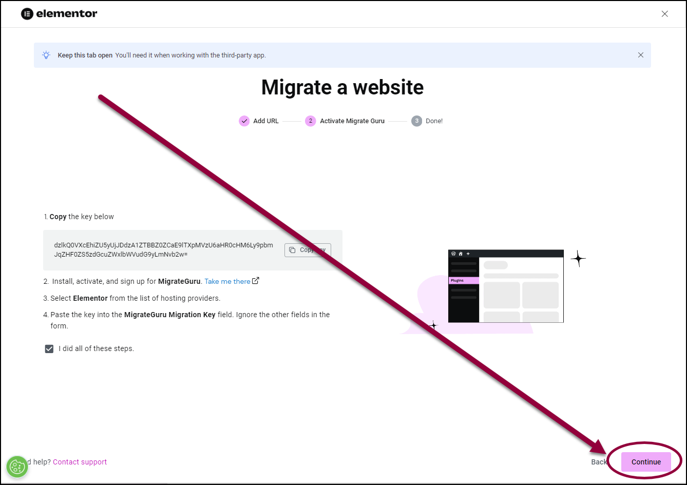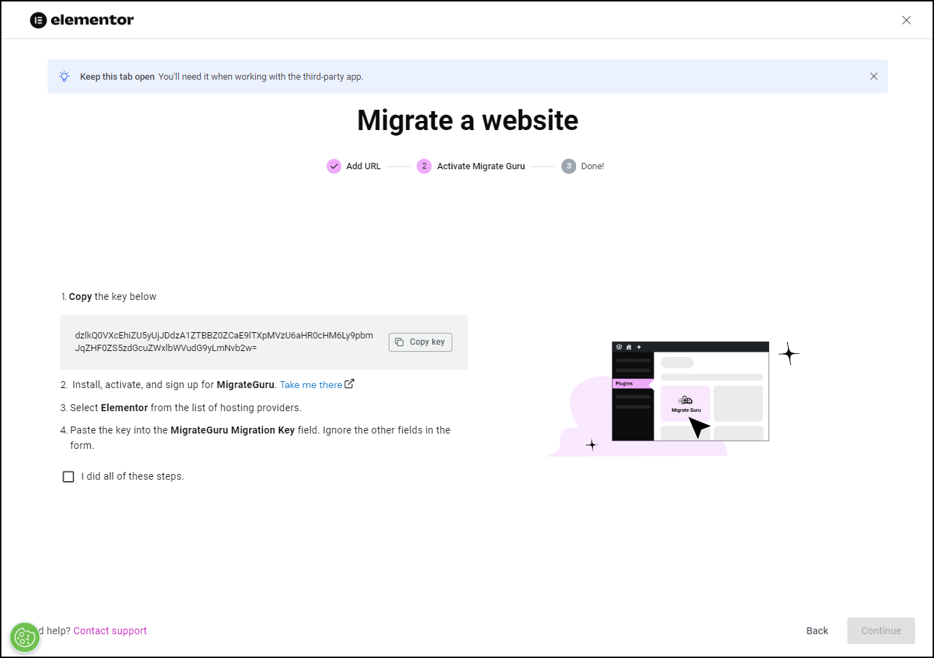 - Scroll down and click Yes I’ve installed it.NoteYou don’t actually need to install Migrate Guru on your destination site. Elementor takes care of this end of the process.