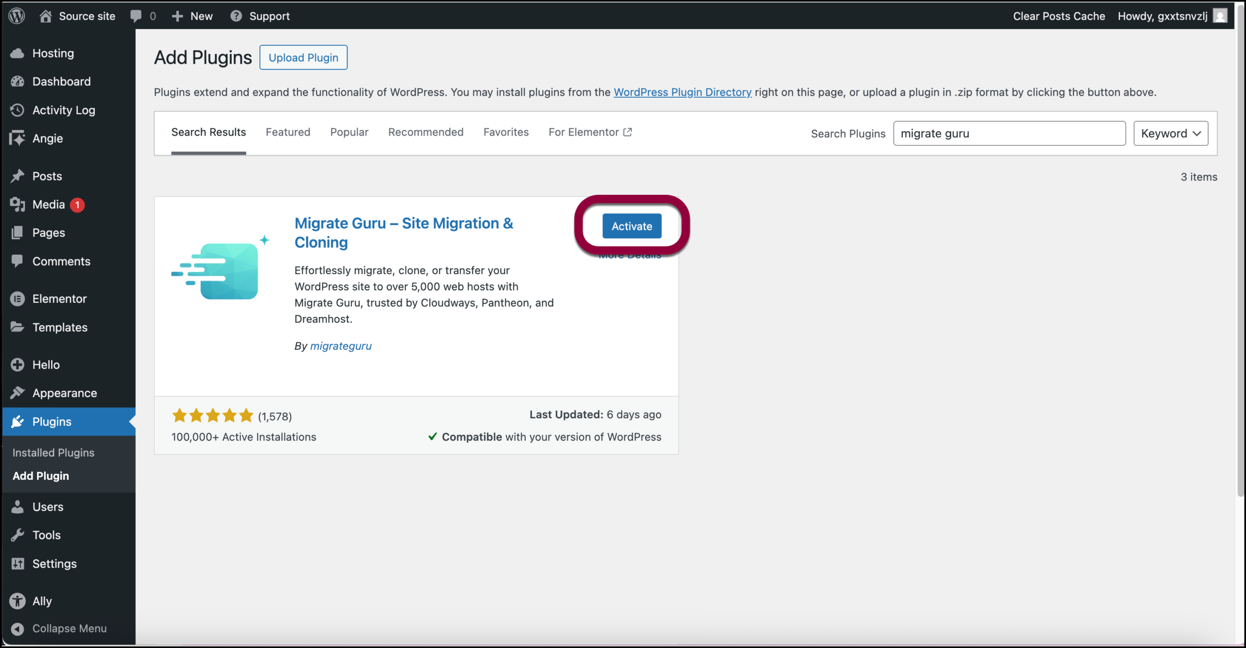 This will open your existing site in a separate tab, ready to install the Migrate Guru plugin. - Search for the Migrate Guru plugin. For details about installing new plugins, see Install WordPress plugins.