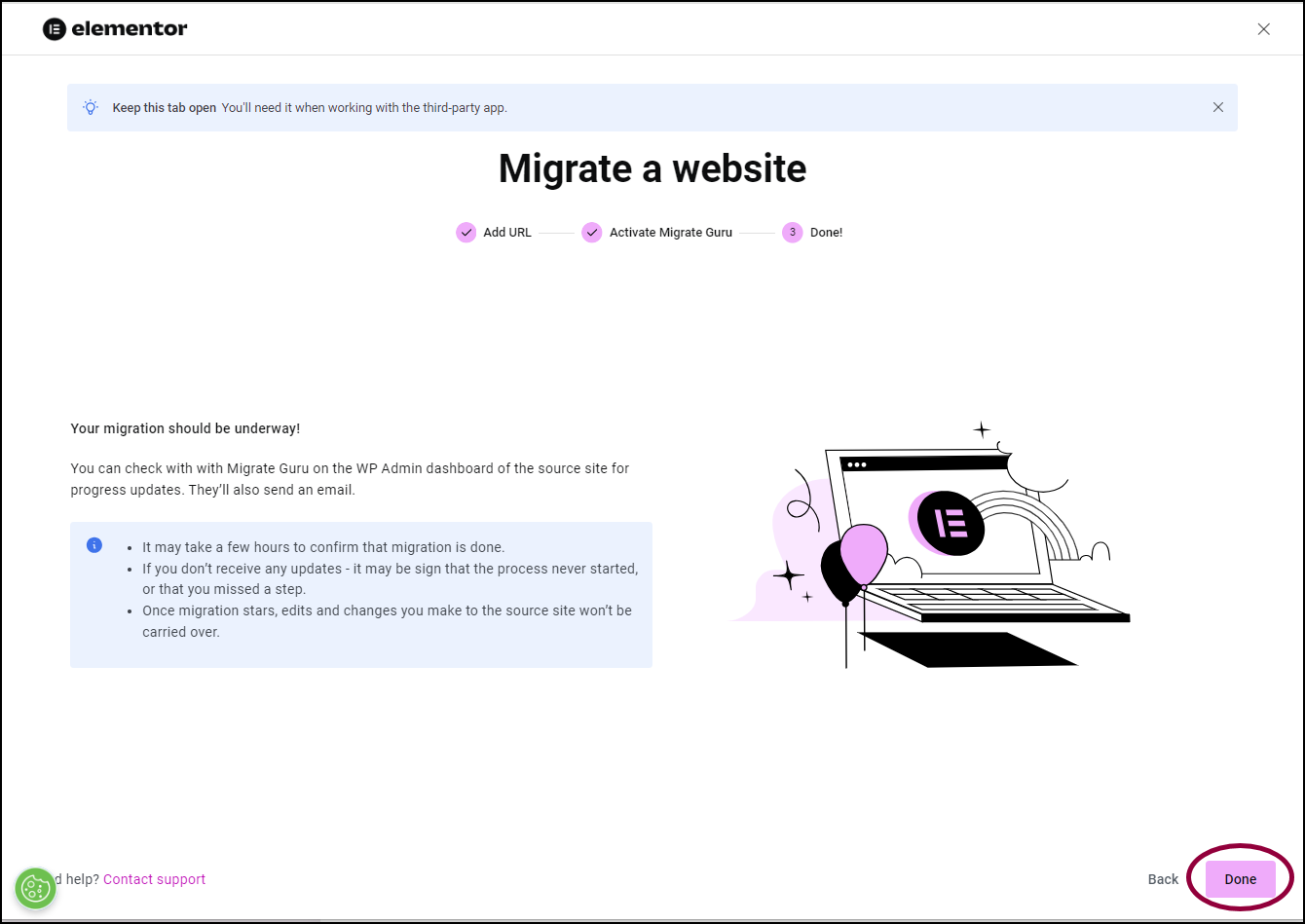 In addition to migrating your existing site, Elementor Host prepares your site by installing Elementor, and setting up one-click login. This means it may be a few minutes before you can start working on your site.