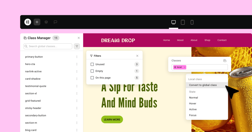 This version introduces two related upgrades that help you manage and reuse styles more effectively: a conversion tool for turning local styles into Global Classes, and new filters inside the Class Manager to keep your library clean.