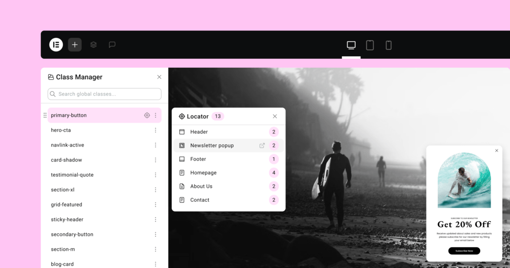 The updated Class Manager helps you maintain control over your design system. Now, each Global Class shows a usage count, so you know how often it’s being used across your site. Clicking on this count opens the Locator Panel, where you can view which pages the class appears on and how frequently. This visibility is especially useful for large sites or collaborative projects where hundreds of utility or atomic classes are in play.