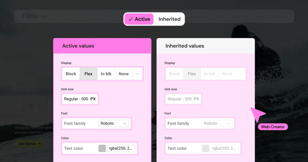One of the challenges of responsive design and class-based styling is understanding where a given value is coming from. Editor V4 Alpha introduces visual indicators for inherited styles. These muted placeholders appear within the control panels, showing you at a glance whether a style was inherited from a Class, a base style, or a different responsive breakpoint.