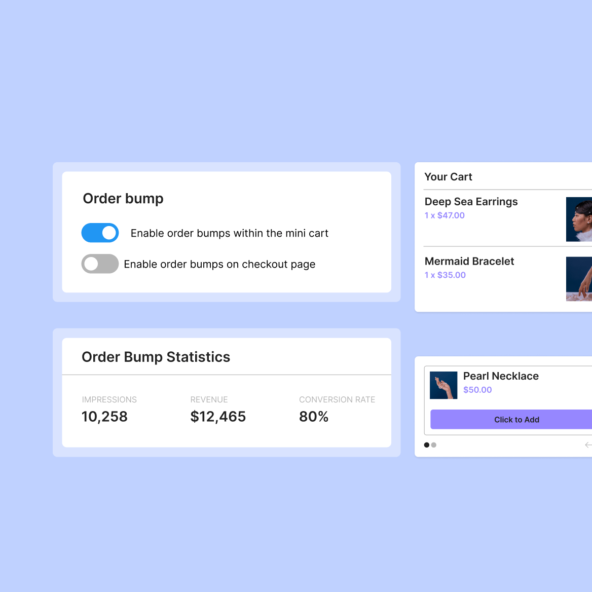Order BumpFeature a product next to the "Place Order" button with an easy add to cart option.IncludedIncluded