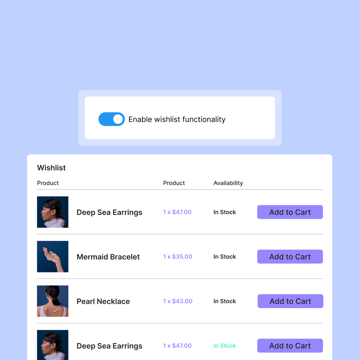 Wishlist functionalityLet your users get to the purchase point quicker and more often with wishlists.IncludedIncluded