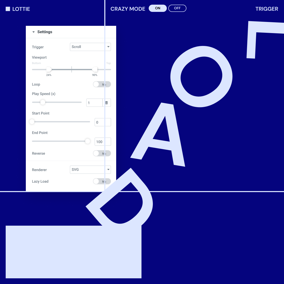 Include any interactive Lottie animation, and control its behavior in Elementor. Designed to not affect your page performance.